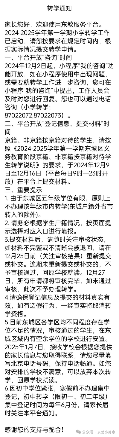 东城2025年转学开始申请!市内五年级无法转入~